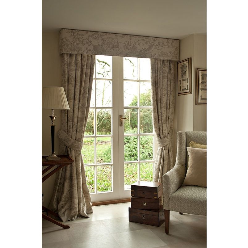 A classic printed toile fabric featuring traditional farming with a countryside theme in a natural beige.