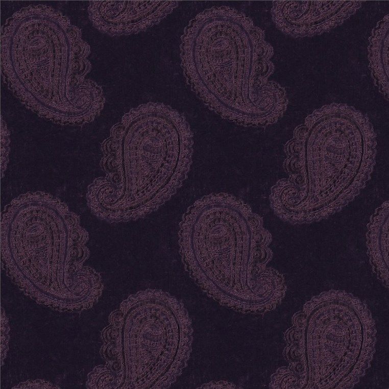 A lustrous velvet upholstery fabric woven with a large scale paisley motif in fig.