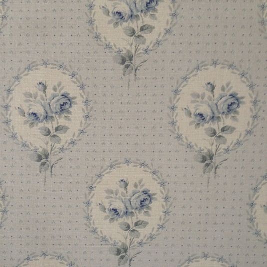 A printed linen fabric with soft, pretty cartouche floral shown in faded blue.