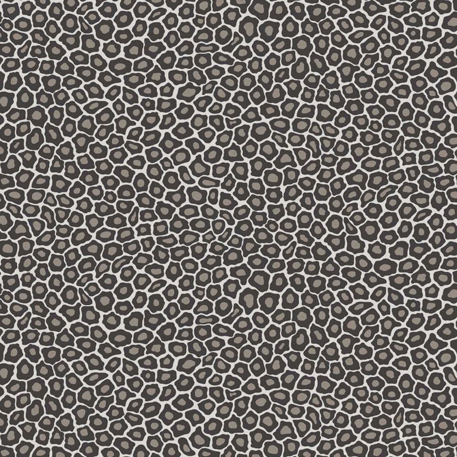 A pleasing wallpaper a small scale animal print design, inspired by the charmingly naive patterning of giraffe spots created by artist Senzo Duma. Shown in black, taupe and off-white.