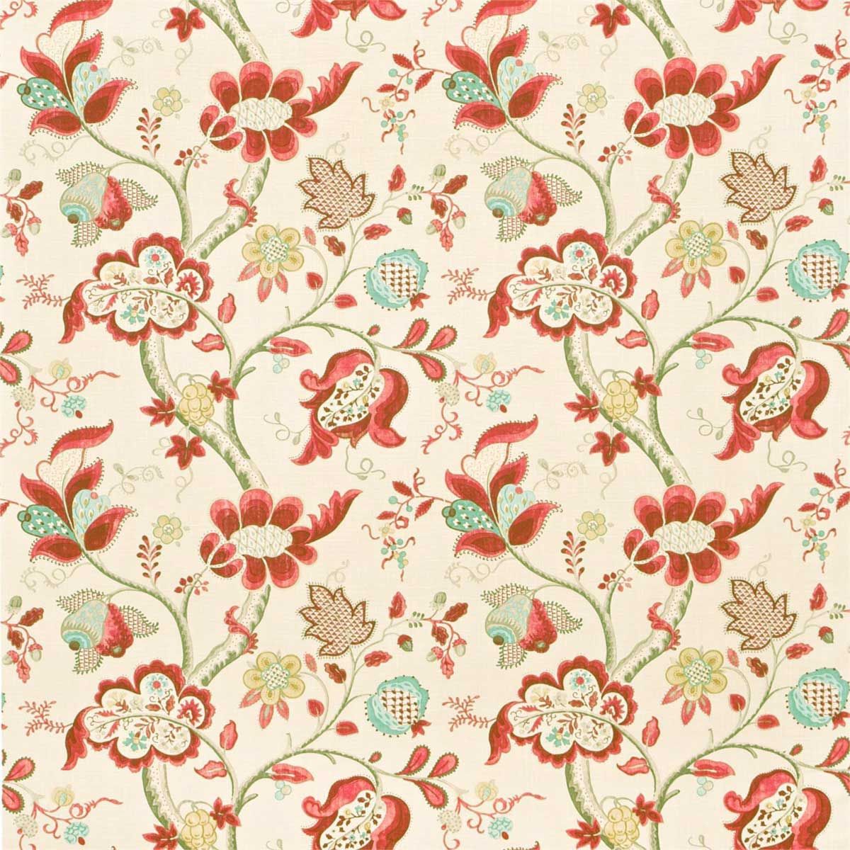 A jacobean tree of life design printed linen in red, aqua and gold on a beige background