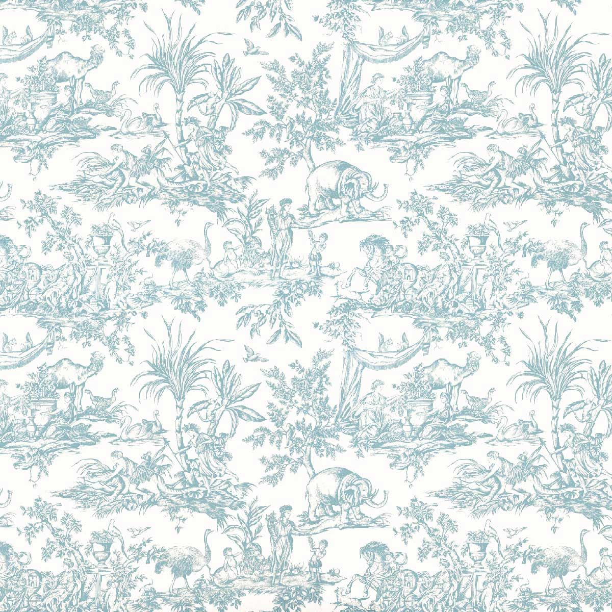 A duck egg blue toile wide-width wallpaper with a beautiful large design. Historical scenes with exotic animals including elephants, camels, ostriches, and lions. It's a beautiful traditional print for country cottage interiors.