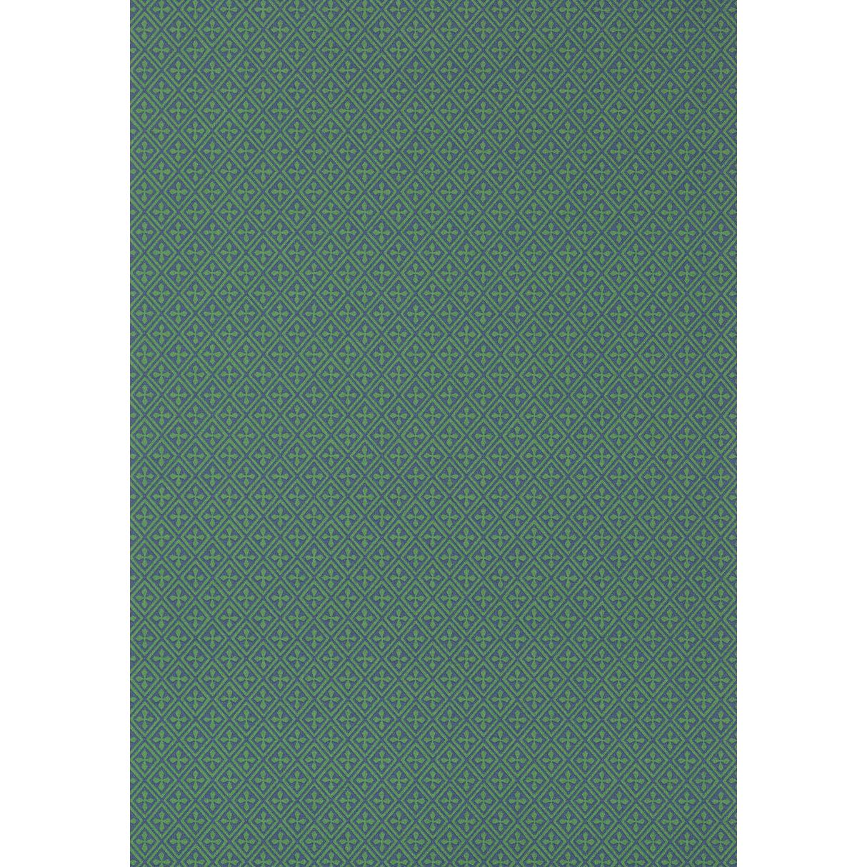 A mesmerizing all-over geometric pattern featuring green diamonds with flower motifs, printed on a blue paper.