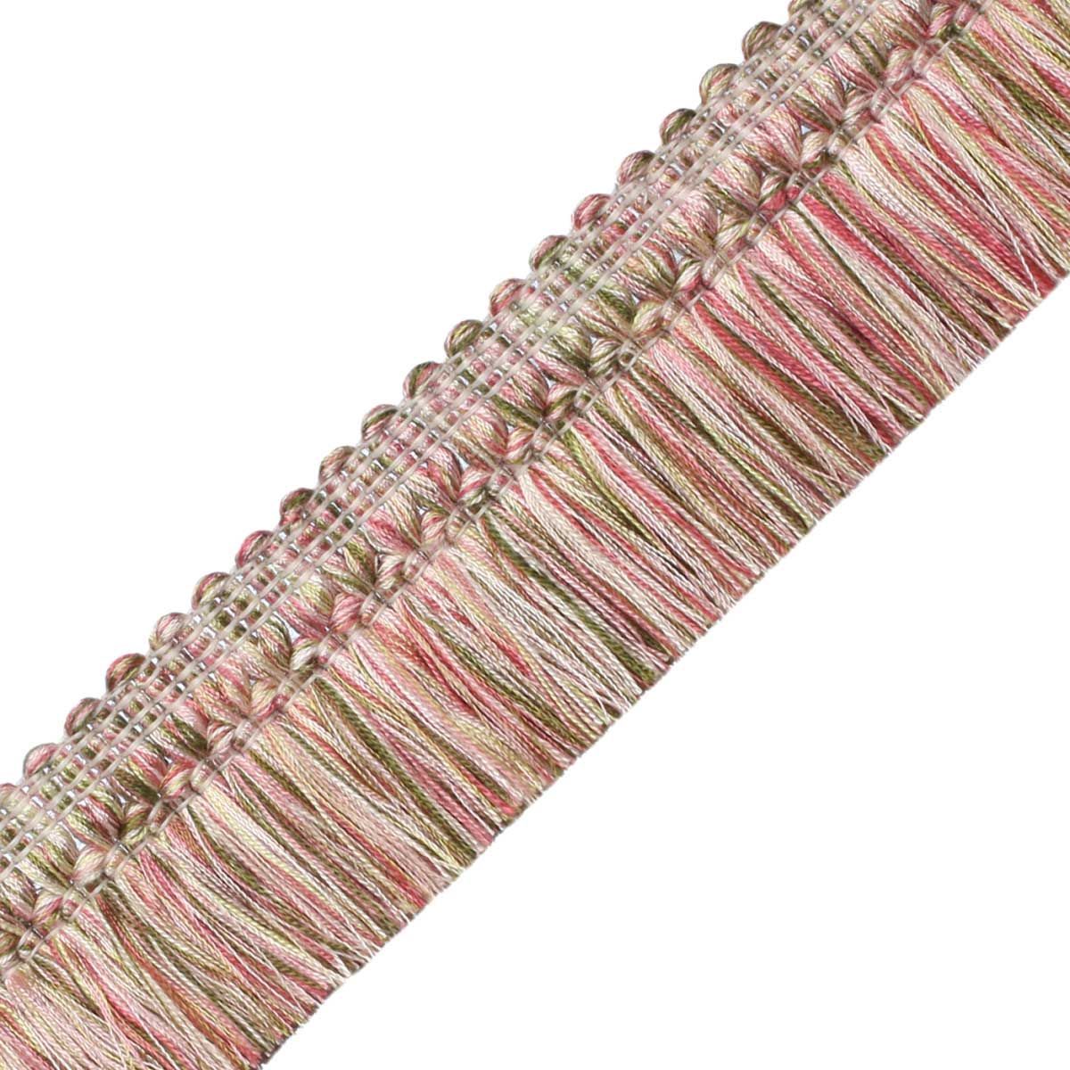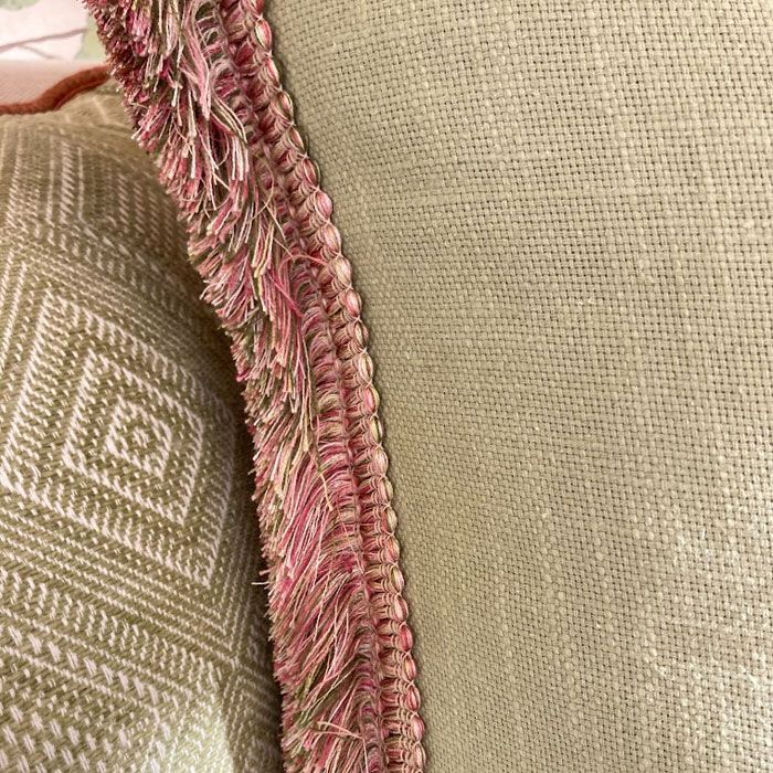 A lovely brush fringe in pinks greens and ivory, it has a slight sheen and will work beautifully around cushions or on the leading edge of curtains.
