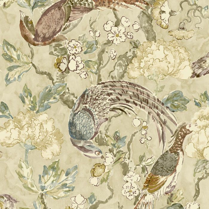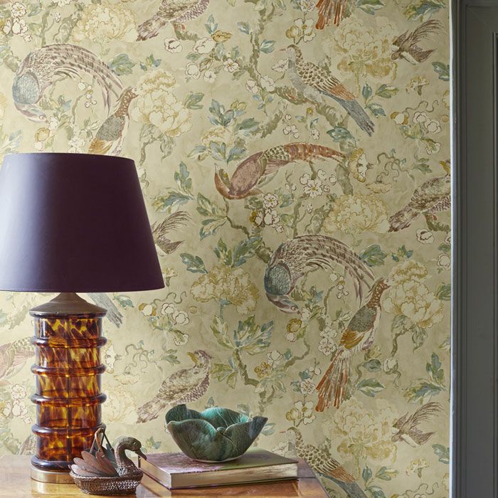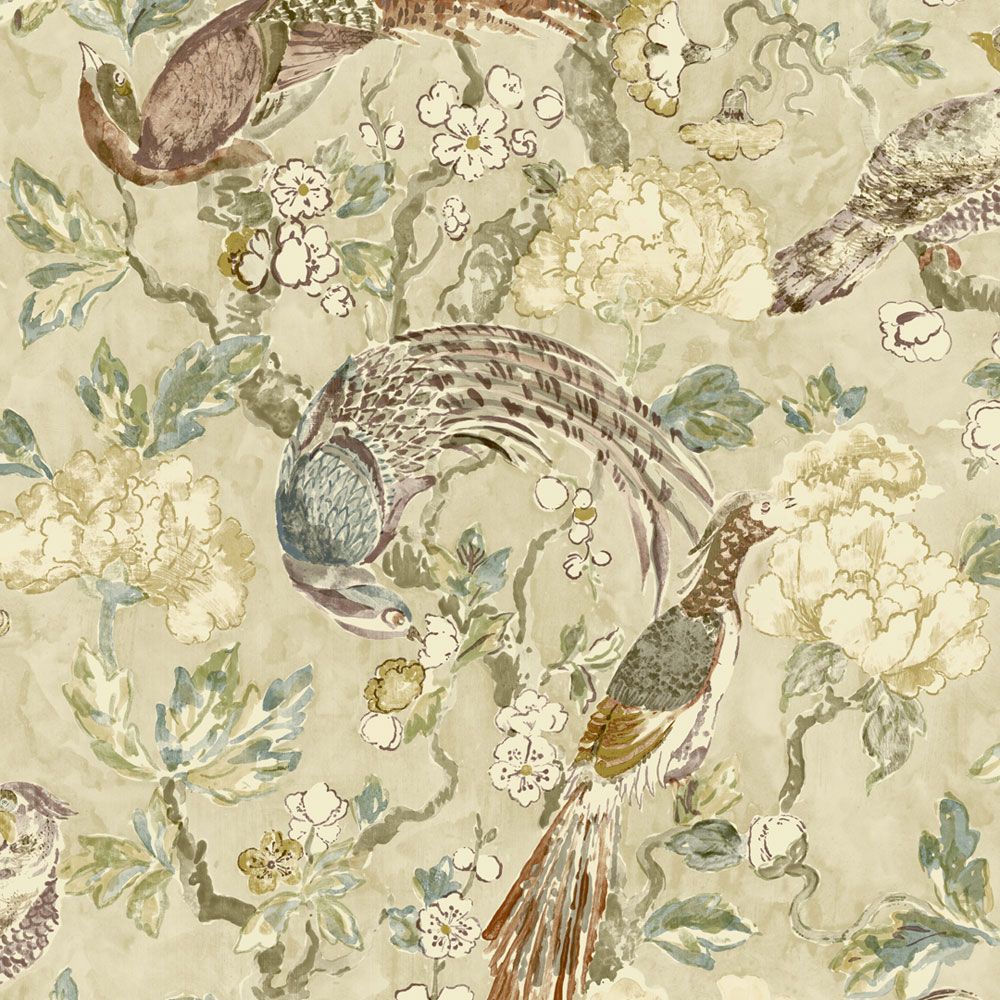An elegant wallpaper depicting birds perched among blossoming tree branches in neutral and brown tones. With its gentle hand-painted feel, this design brings a serene, calming atmosphere to any interior.