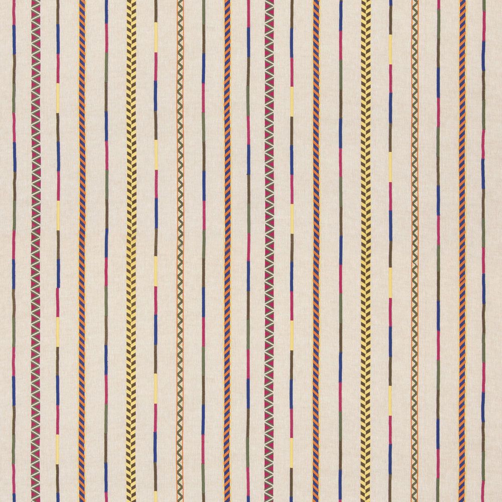 A playful design featuring colourful embroidered stripes on a neutral linen ground. The stripes alternate between blocked colours, zig-zags and chevron detailing in multicolour. This fabric is a great choice for curtains and cushions.