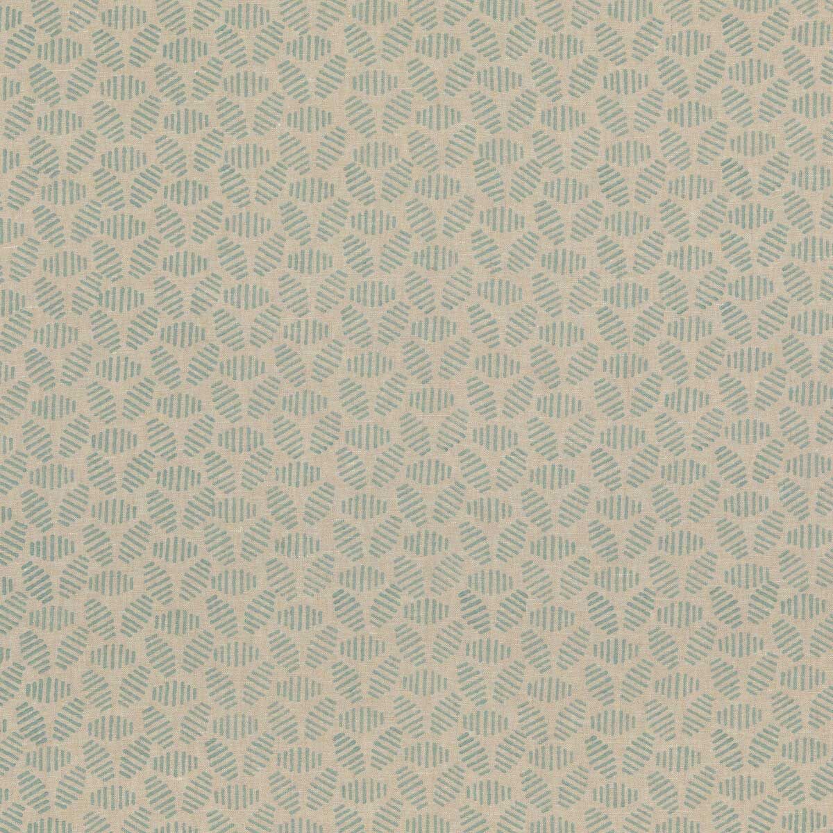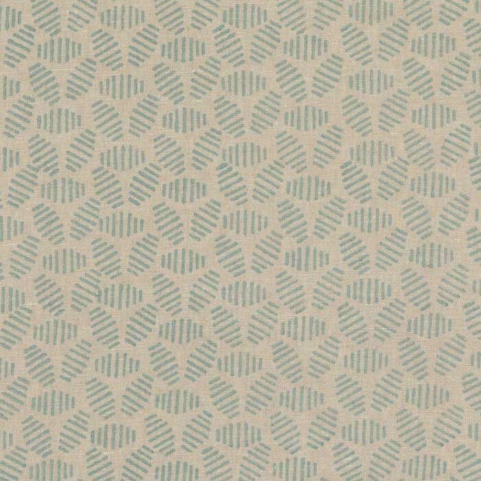 A duck egg blue geometric linen fabric with striped hexagons across the neutral material. It's a young, modern design and the small hand-block print is perfect for pairing with florals.