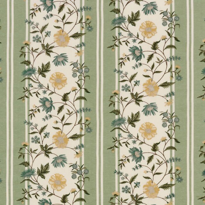 Embroidered asters and climbing florals weave their way between green woven stripes in this beautifully detailed design. Inspired by an archival painted artwork, the pattern is brought to life on a richly coloured cotton–linen blend, perfect for adding character to curtains and soft furnishings.