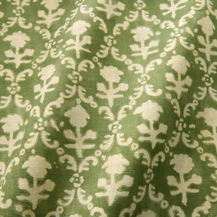 Delicate and refined, this decorative linen design takes inspiration from traditional Asian folk art. A softly structured trellis pattern in green frames simple floral motifs, creating a graceful flow and understated harmony across the fabric. it’s ideal for curtains, upholstery, and soft furnishings.