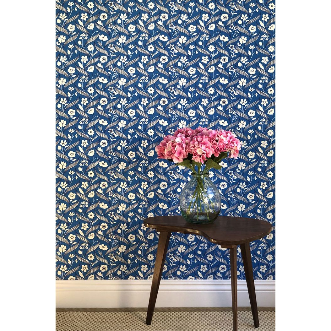 A trellis-like pattern in rich blue and white, featuring leaves and wild flowers in a lino print style creating an on trend wallpaper, a lovely choice to a powder room.