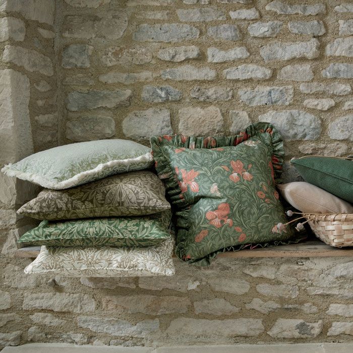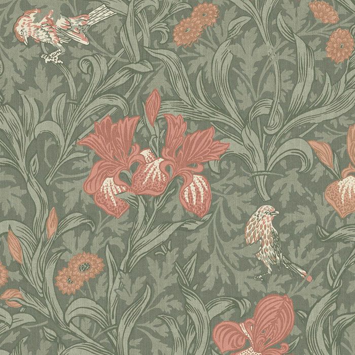 Swirling leaves and iris flowers in orange and green tones are accented by songbirds. From the William Morris Gallery archives, this fabric is perfect for cushions, curtains, and headboards, bringing timeless botanical charm to interiors.