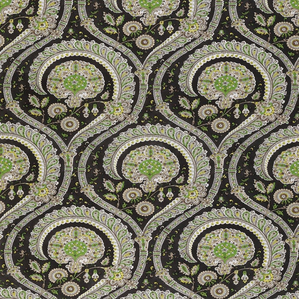 This paisley fabric is inspired by 17th and 18th century textiles which were produced in East India and made popular in France. The green and brown detailing on a black ground make for a dynamic reimagining.