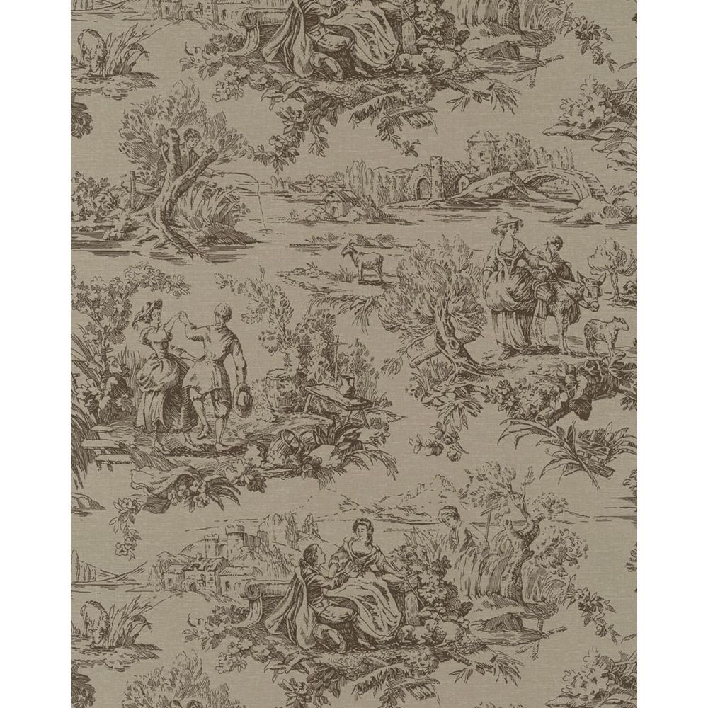 A gorgeous Toile de Jouy design in dark brown on a taupe ground. The intricate and etched image style shows people fishing, dancing and gardening. A contemporary reinterpretation of a classic 18th Century design.