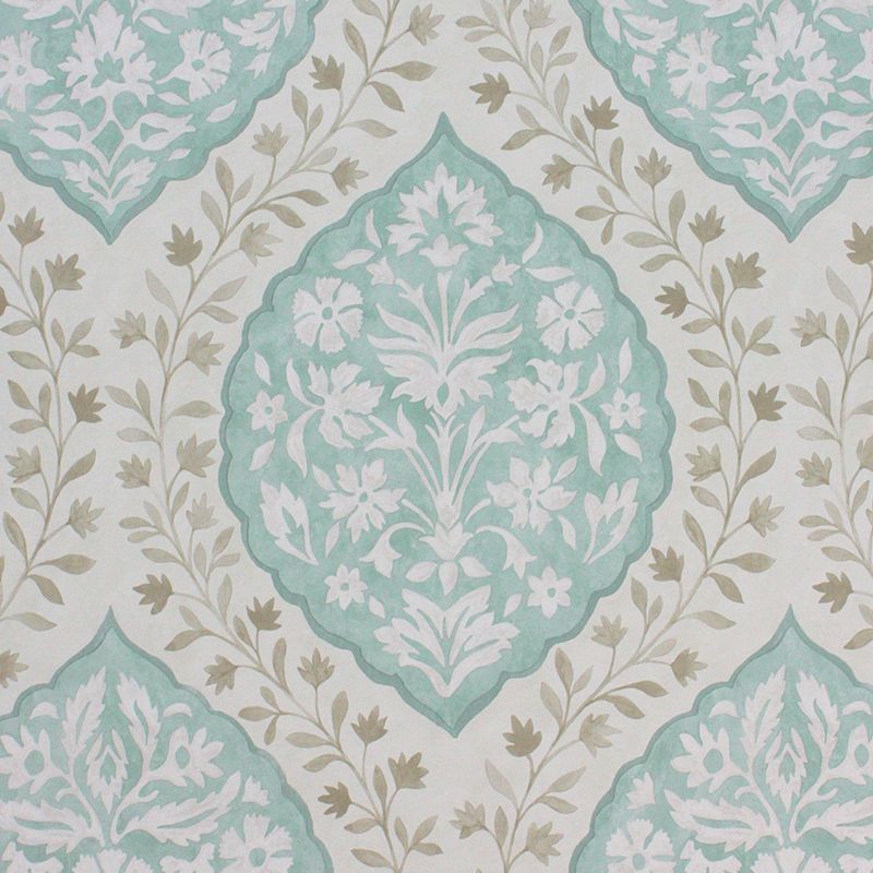 A floral cartouche trellis in aqua and taupe on a crisp off white paper. A pretty large scale pattern that was named after the artist’s daughter.