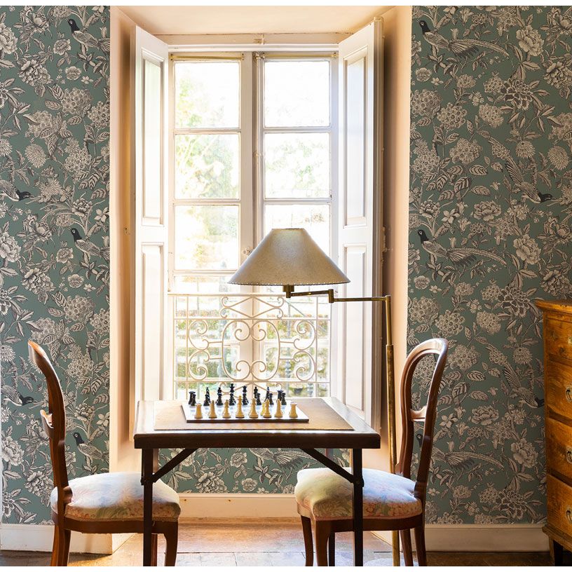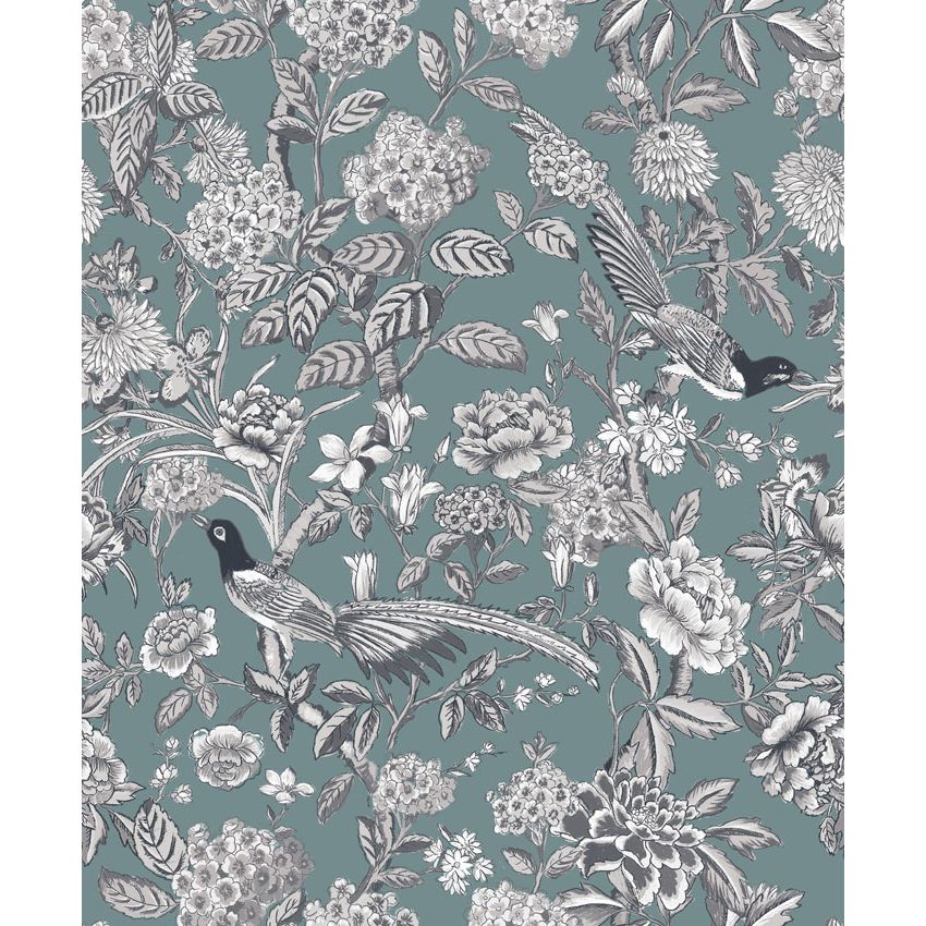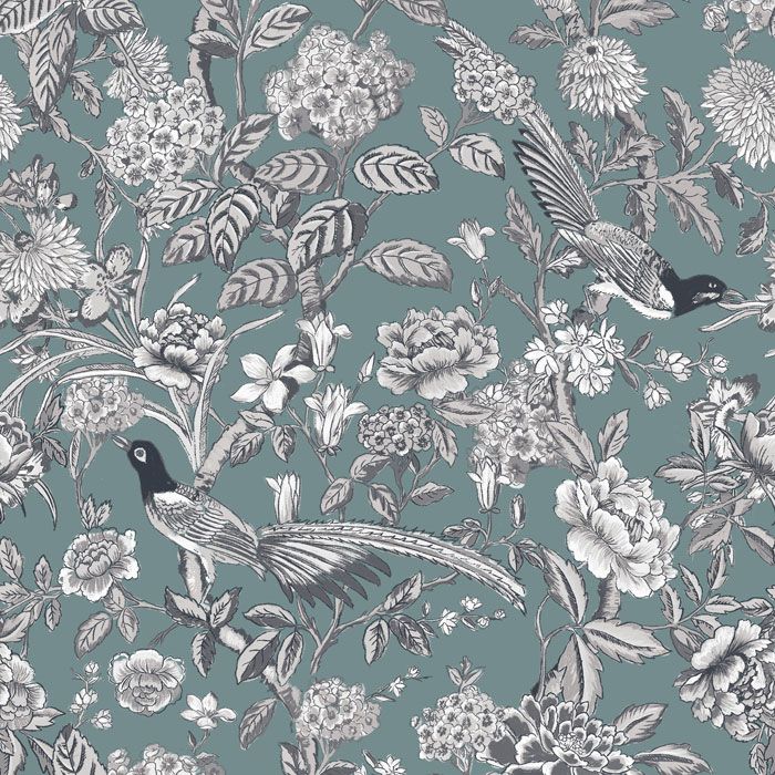 A floral climbing tree design with feathery birds pecking at the beautiful flower heads, in grey and charcoal on a duck egg blue base. A stunning wallpaper that would elevate a country house look.