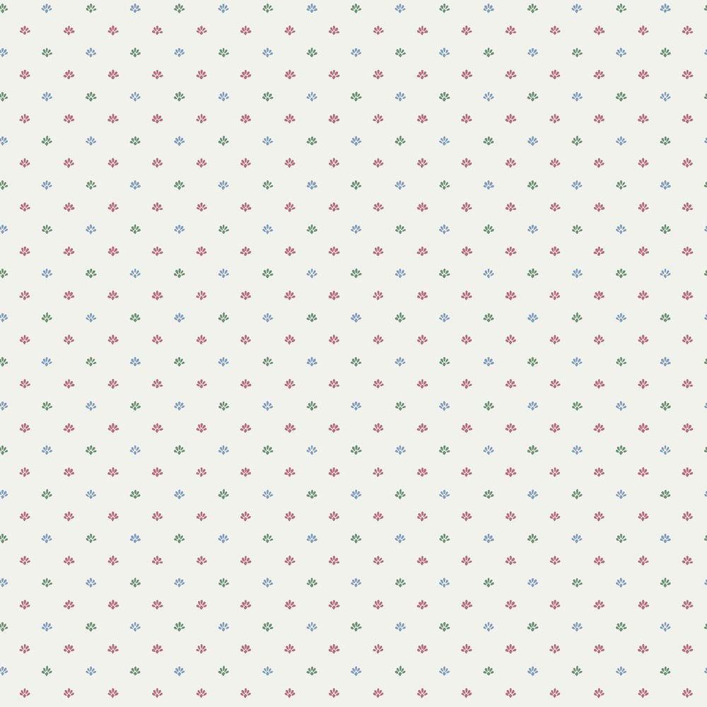 A ditsy, small-scale wallpaper in red and blue on white, featuring a delicate repeating motif. Perfect for adding a gentle decorative touch to country cottage interiors.