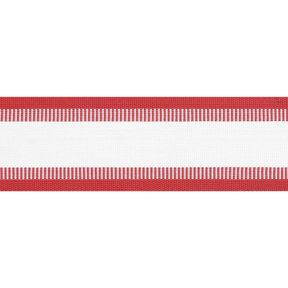 A wide width tape with a striped ottoman weave in deep red and white. This versatile trimming provides a bold finish to soft furnishings and can be folded for a decorative application. Suitable for outdoor use and is available in other colorways.