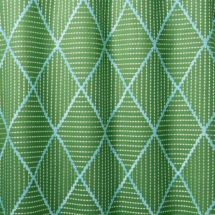 A refined diamond-trellis embroidery in green and blue, created with directional stitches and subtle rickrack detailing for added texture. Worked on a cotton linen ground, it offers a crafted, graphic look ideal for curtains, headboards, and cushions.
