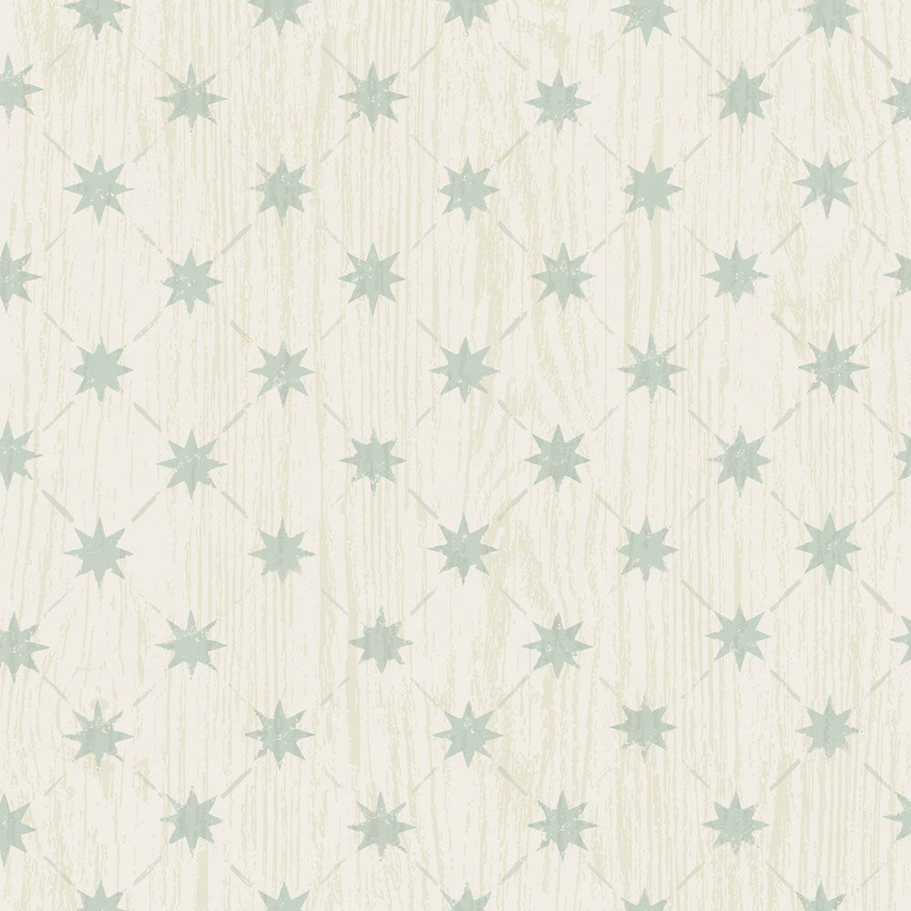 A classic wood-grain paint effect forms the backdrop of this wallpaper, overlaid with a trellis of neatly stencilled stars in duck egg and grey tones. The subtle strié texture adds depth and a gentle three-dimensional quality, giving the design a rustic charm ideal for relaxed, characterful interiors.