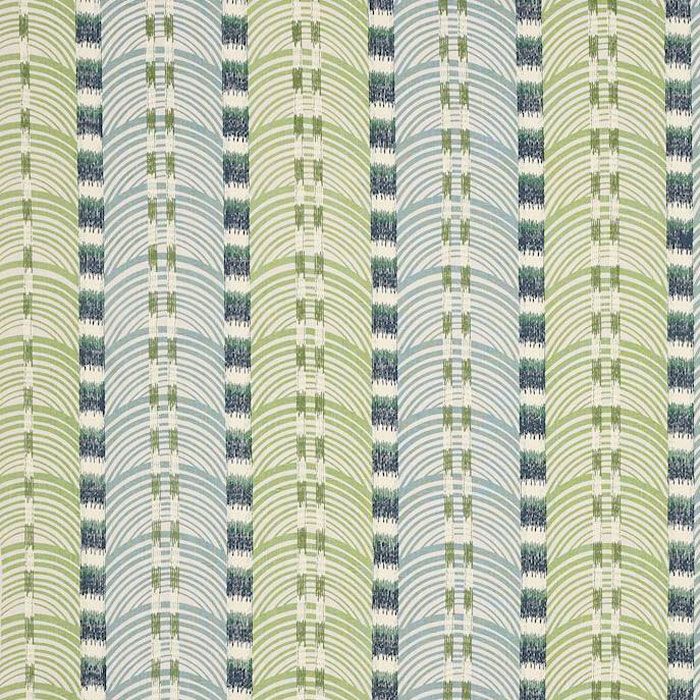 Sunsari combines print and embroidery in a quietly expressive way, pairing two-tone arched motifs in blue and green with bold, ikat-inspired stitched detailing. The alternating elements form a relaxed, rhythmic stripe with subtle texture, giving the design a calm, modern character that feels both decorative and effortless.