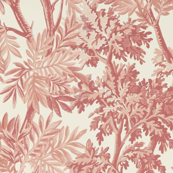 Tapestry Trees is a highly decorative feature wallpaper in soft red tones, where oak branches intertwine with other woodland species to form a soft, serpentine stripe. Perfect for bringing a gentle woodland touch to your interiors.