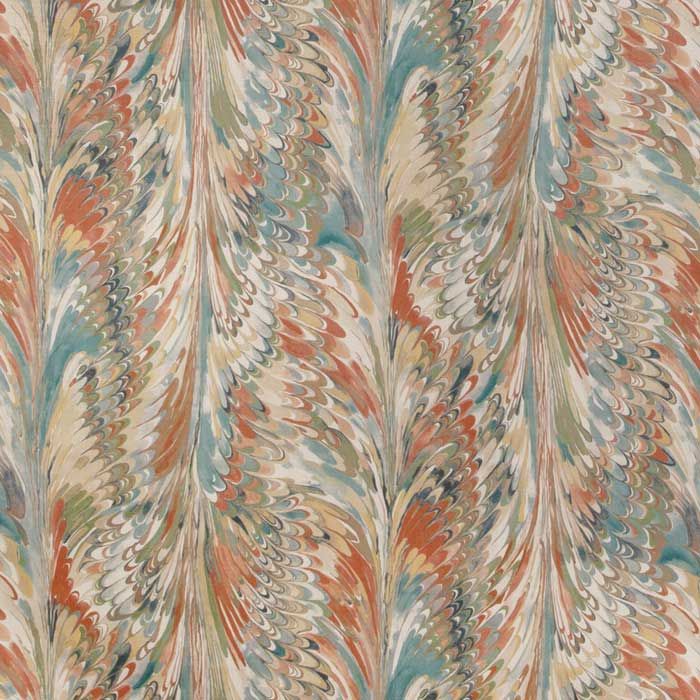 A striking marbled design inspired of flowing feathered plumes in terracotta, ochre, teal and soft neutrals. Perfect for upholstery, curtains and statement home accessories.