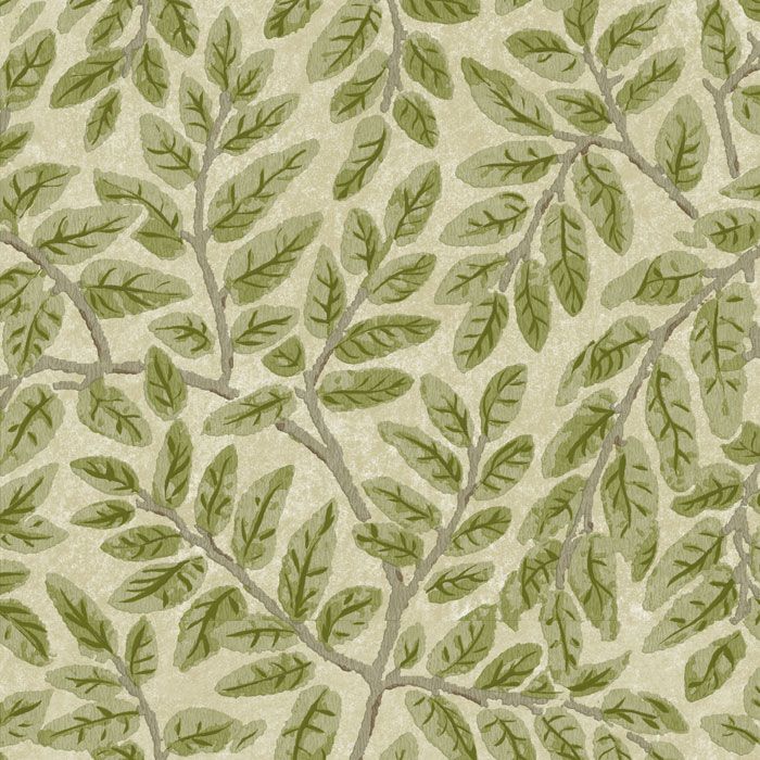 A pretty all over leaf design printed with a painterly effect giving it a rustic, soft look. A timeless wallpaper in olive green on a beige base, ideal for a country cottage interior or using amongst bolder patterns.