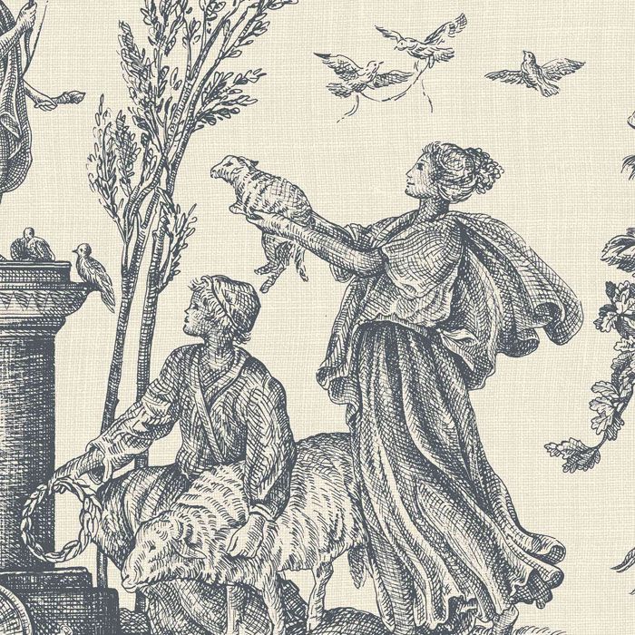Based on engravings by Jean Baptiste Huet, this classic toile features two scenes of a joyful community village life with cattle, musicians and surrounding greenery. With dark navy detail on a cream ground, this design would suit a country house interior. Matching fabric available.